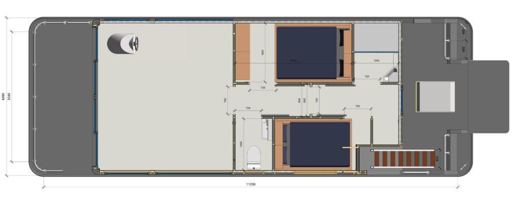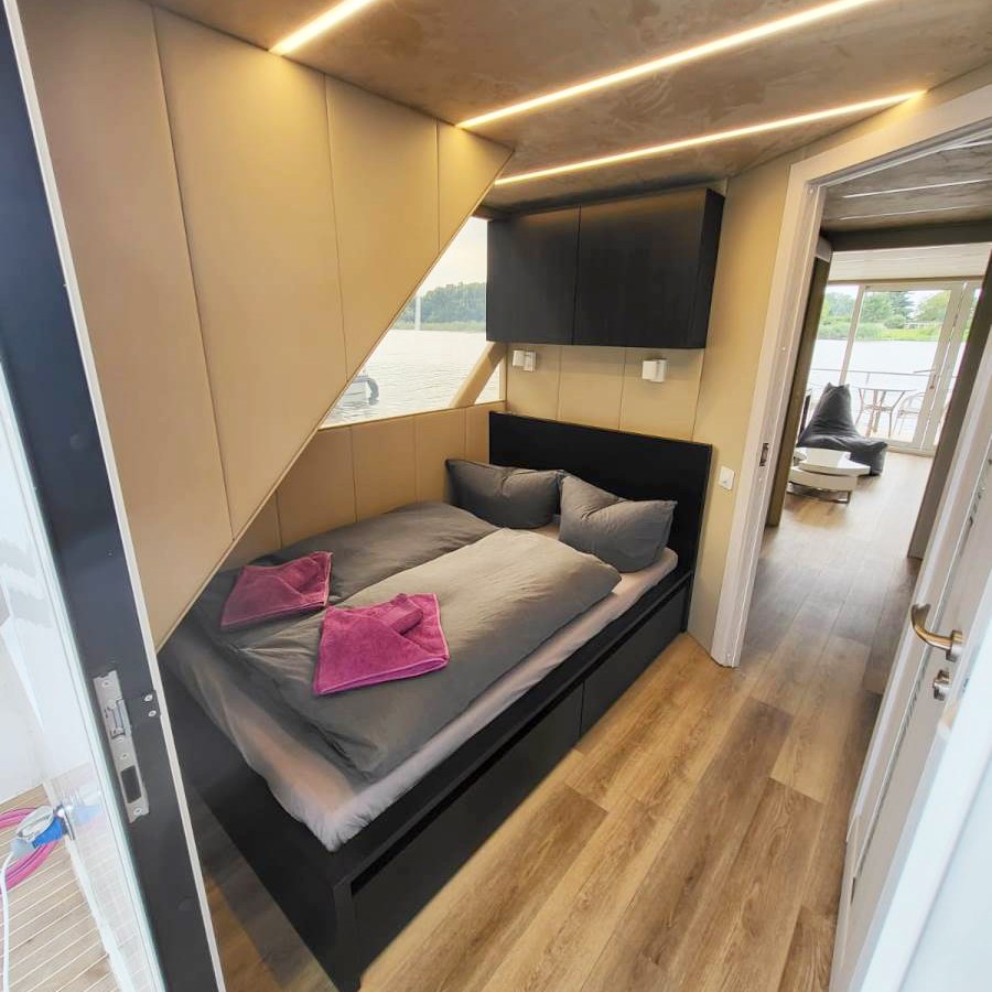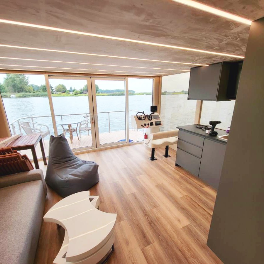 Ai – it means „Artificial Intelligence“. The houseboat is equipped with automatic user comfort systems, automatic charging, and an automatic heating system. Almost everything you’d expect from onboard automation for a reasonable price.